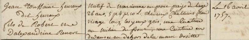 « Jean Toussaint Heureux, dit Heureux. Natif de Marchienne au Pont, pays de Liège, 26 ans, 5 pieds 4 pouces 10 lignes5 (soit environ 1,75 mètres), cheveux châtains clairs, visage long, les yeux gris, une cicatrice au milieu du front, une cicatrice en dedans et en dehors de la main droite ».