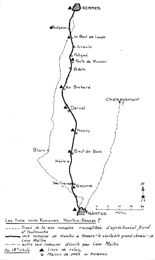 Sur les 21 lieues de la route de poste de Nantes à Rennes (105 km), on compte sept relais de poste aux chevaux : en partant de Rennes, le Bout-de-Lande, Roudun, La Bréharé, Derval, Nozay, Bout-de-Bois, Gesvres11
