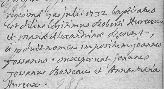 Acte de baptême de Jean Toussaint Heureux consigné le 27 juillet 1732 par le recteur de Marchienne-au-Pont. Les registres paroissiaux du Hainaut sont alors rédigés en latin. Son parrain est Jean Toussaint Bosseau